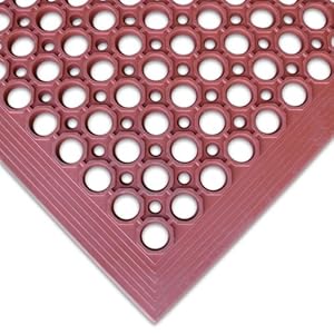 Rubber-Cal's 1/2 inch Dura-Chef is a natural rubber anti-fatigue drainage mat that is available in 2 colors: a general purpose black and a grease resistant red (i.e. natural rubber blended with nitrile) and is perfect for the light duty commercial and residential kitchen areas. Being that this mat is made from natural rubber, this is an ecologically responsible product. Natural rubber is an extremely comfortable and supple material and offers superior anti-fatigue underfoot comfort and support to make long hours of walking, working, and standing far more comfortable. The resilience of the natural rubber also provides protection to parts and equipment that may be dropped on the floor. This mat has large holes to provide excellent drainage and allowing liquids, greases, oils, and debris to pass through leaving the top surface clear of hazards thus increasing safety. Additionally, the perimeter of the mat has a beveled edge to allow easy access to wheeled equipment while increasing safety. The high coefficient of friction (i.e. slip resistance) found in natural rubber maintains excellent traction even when the mat is wet. At 1/2 inch thick test drainage mats are designed for light-duty applications like commercial and residential kitchens, cafes, delis, and coffee shops. This mat weighs roughly20lbs and stays down under its own weight and is light enough to remove it when cleaning is necessary. The 1/2 inch Dura-Chef is an eco-friendly, extremely durable anti-fatigue kitchen drainage mat.